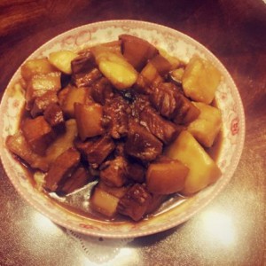 电压力锅好了后倒回炒锅,加入刚掰好的土豆翻炒一下然后炖熟
