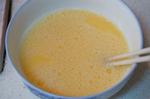 鸡蛋中加入温水搅拌均匀,温水的量在鸡蛋的1-2倍之间。