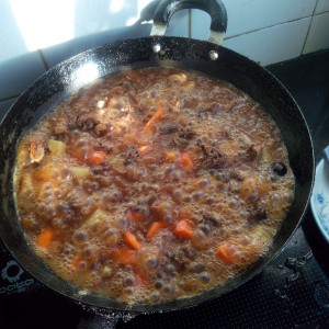 倒入啤酒一杯300ml,还有切好的土豆,胡萝卜,翻炒!