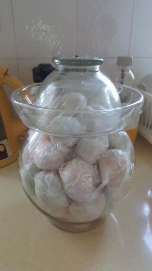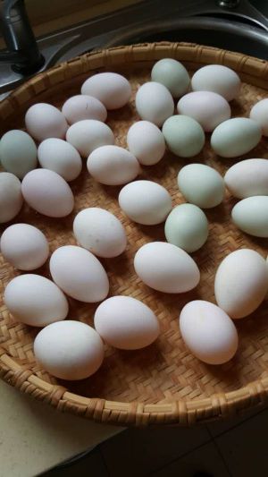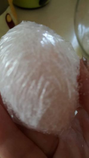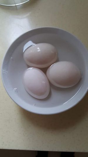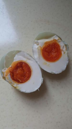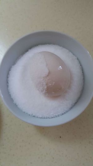 再放在盐碗中翻滚,让盐包裹鸭蛋