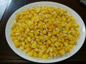 事先准备好的玉米粒。在超市买的生玉米,煮熟后剥下。想省事也可以买玉米罐头备用 。