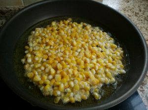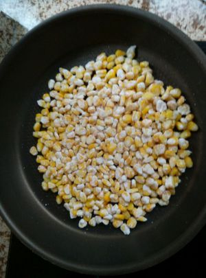 在平底锅中滴入少量的油,把裹着糯米粉和玉米淀粉的玉米粒倒入平底锅中,铺平。