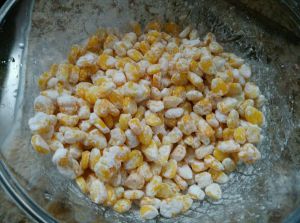 把玉米粒倒入适量的糯米粉中,可以比图上还多一些,搅拌均匀。