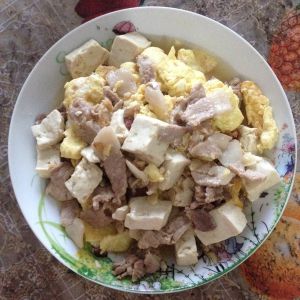 锅加油烧热,放入切好的肉片翻炒至肉色变白,加入蒜和鸡蛋、豆腐一起翻炒均匀,有蒜香即可,加入少量水中火炖5分钟后加入适量盐和鸡精炒匀起锅。