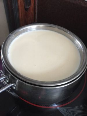 继续隔水煮,煮热之后要边煮边搅拌,这时会感觉牛奶越来越浓稠,自我感觉浓稠度达到时就关火,放凉
