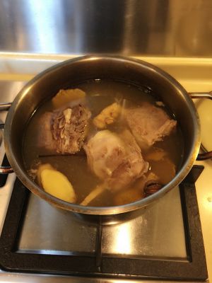 锅里加入姜片,大料八角,料酒,羊排洗净切大块上锅煮熟,