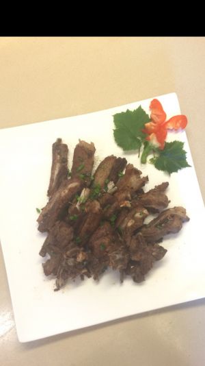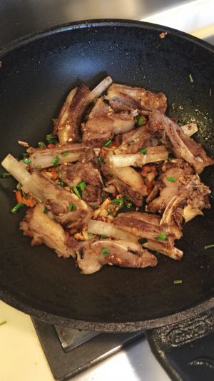 锅油热下入蒜粒,姜粒,青红椒粒,大葱粒小火炒香后开大火倒入羊排番炒,加入几滴芝麻油,是盐,胡椒粉,白糖少许提味,酱油少许,辣椒粉少许翻炒羊挑10多秒后加入孜然粉翻炒10秒后加入葱花关水装盘