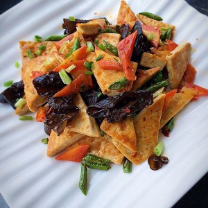 原料准备,豆腐切三角,豆腐用前用盐水浸泡,不宜变味切不易碎 胡萝卜三角 豇豆长菱形 泡发黑木耳撕小块 葱末