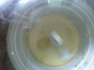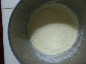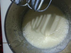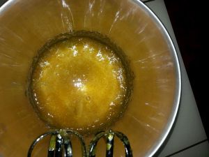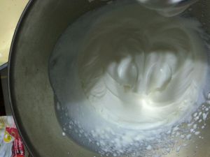 蛋白和蛋黄分开,蛋黄和糖一起打至体积发白,膨大。