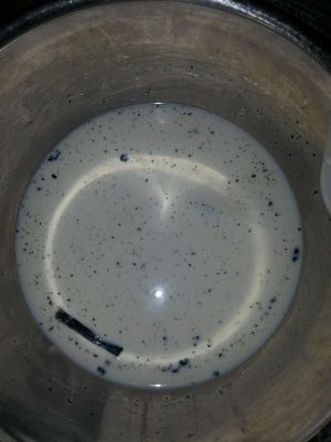 把香草籽和皮,一起放入牛奶中,隔水加热,70 80度的样子,比较烫手。