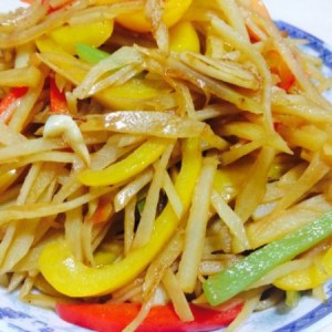 翻炒至土豆丝全熟,建议别炒太久,以免土豆丝变软,碎掉。加入少量生抽或酱油,盐适量(比平时要少!已经放了老抽和酱油了),鸡精味精适量。转大火翻炒几下,立刻出锅。