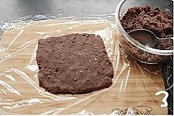 案板上铺上保鲜膜,将红豆沙在保鲜膜上压平并弄成正方形。