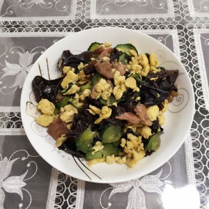 加入黄瓜翻炒1~2分钟后,放入之前炒好的鸡蛋;加入适量盐、酱油、蚝油翻炒均匀即可出锅。(盐用量掌握不好的可以少量、多次的加入~)