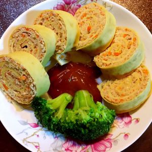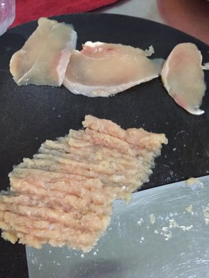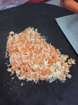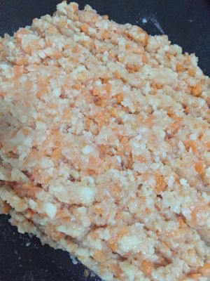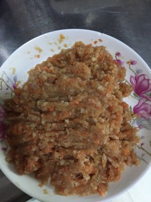 鸡肉泥和胡萝卜藕混在一起剁至泥