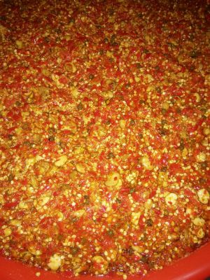 将小米辣,生姜打碎,没有料理机的剁碎!