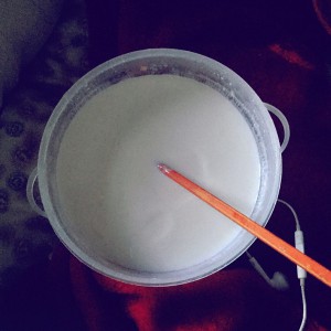 然后把酸奶倒进牛奶里搅拌,一定搅拌均匀!