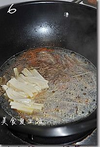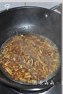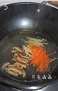 用锅中剩余的油煸炒冬笋丝、胡萝卜丝和香菇丝后,倒入一大碗高汤(或者清水,约400ml),加入一汤匙半生抽,烧开后小火煮2分钟。