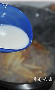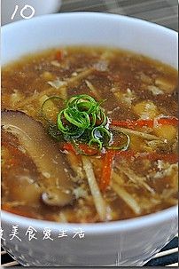 一汤匙淀粉用水调开,中火保持锅中滚开状态,缓缓倒入水淀粉,边倒边推匀,锅中汤呈稍粘稠状即可。(淀粉水不是全部用完的哦,看到汤呈稍粘稠状即停止倒淀粉水)