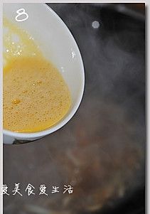 打散的蛋液缓缓淋入锅中,边用汤勺推动,使蛋液形成漂亮的蛋花。