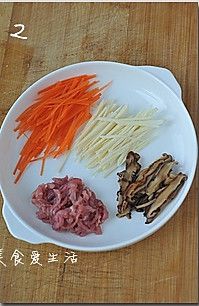 香菇、冬笋、胡萝卜和里脊肉切丝、里脊肉用蚝油料酒抓匀腌制