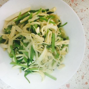 然后放入香干或千张丝,翻炒片刻。