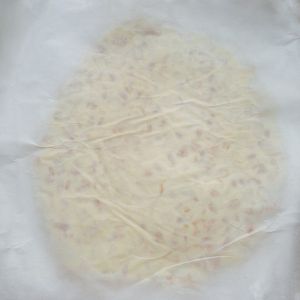铺在事先准备好的油纸上,上边覆盖一层油纸,用擀面杖擀到自己想要的厚度