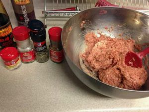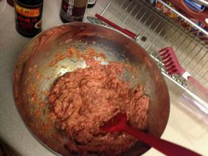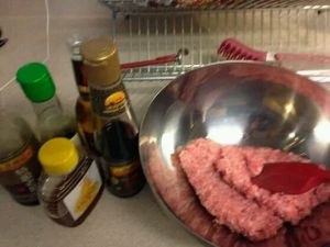然后哩,加调料,料酒2大勺,生抽1大勺,香油1大勺,蜂蜜2大勺!然后就开始顺着一个方向搅…要一直搅到有劲道又顺滑的样子!