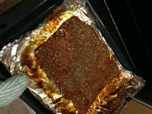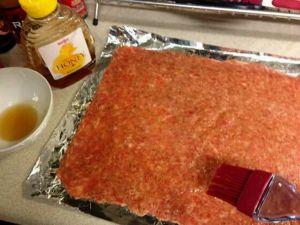小心翼翼的把已经冷藏定型的肉肉翻到锡纸上(tip:现撕开上面一层的保鲜膜,盖上锡纸,然后翻身把另一边保鲜膜撕下来)。烤箱预热180度(355华氏),在肉上刷上蜂蜜!