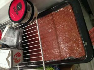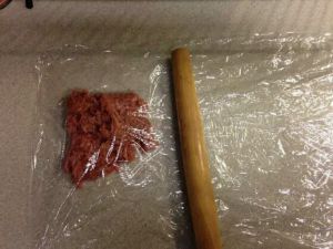 量好烤盘的长度,扯2.5倍长的保鲜膜,然后捞一勺肉在保鲜膜中间,把保鲜膜对折,把肉包里面,用擀面杖擀平!这是个技术活,慢慢来!把肉擀到2至4毫米厚。