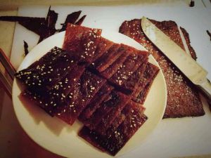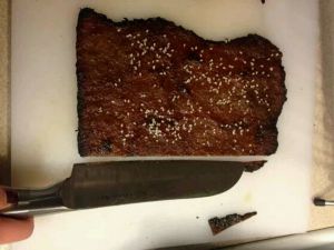 一共烤25分钟,肉擀的比较薄的话,25分钟会有点焦,每6,7分钟翻个面,再刷点蜂蜜,最后可以撒点芝麻