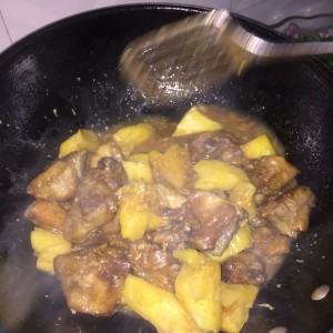 倒入刚刚剩下的调料,翻炒,加入少量的水、生抽,老抽、白糖、醋