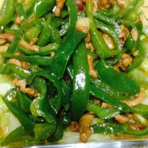 肉盛起后,锅内留有少许油,加入青椒快速翻炒,加入少许盐,生抽,继续翻炒,加入一点点水,翻炒。待青椒变软后加入之前爆好的肉丝,一起翻炒,再次加入少许生抽,要出锅时滴一两滴醋即可