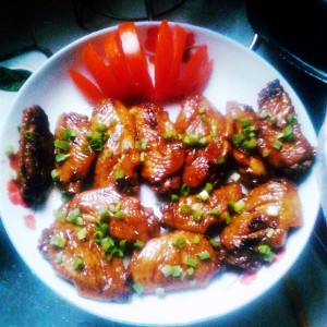 煎至表面有点带淡淡的金黄色,可加一点点料酒(只要一点点,太多会使鸡翅充满料酒的味道。。。)