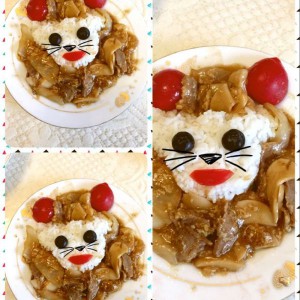 米饭用磨具做出小熊的样子。用蓝莓西红柿装饰眼睛和嘴巴。