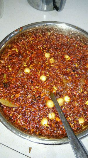 先倒入三分一的油并且不停搅拌让所有辣椒都湿透
