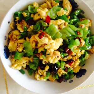鸡蛋调成糊状,下锅将鸡蛋煎泡,下青椒和干辣椒、花椒翻炒,依次下泡菜粒、葱段翻炒起锅
