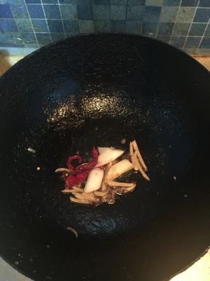 葱切段,姜片切丝,与干辣椒、花椒粒放入热油中