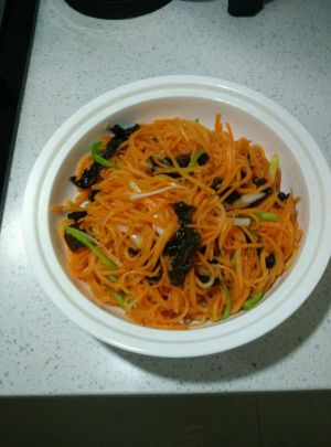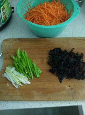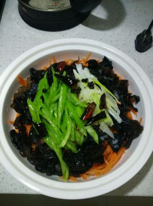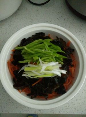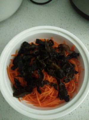胡萝卜轻过热水再过冷水,木耳焯水后切丝,装盘。