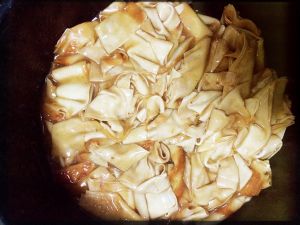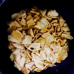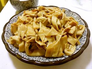 爆锅,热油下酱油,接着下豆皮。加入黑胡椒。油稍微多点,豆皮炒出来才好吃。一直翻炒到豆皮微微变色,盛出备用。