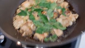 出锅前2分钟左右放入清洗干净沥干水分的九层塔。九层塔炸焦,鸡肉块变焦黄色时即可捞出控油了。九层塔一定要晾干水分,不然下油锅时会溅油!可以在炸好的鸡肉块上撒少许黑胡椒碎,吃的时候可以搭配蛋黄酱或是番茄酱口感更佳!