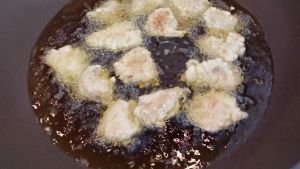 全部裹好以后锅里油烧7成热时放入鸡块小火慢炸。