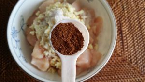 加入6克五香粉。然后抓拌均匀,腌制2小时入味。我们吃的盐酥鸡块最主要的调味料放的不是椒盐,而是五香粉。