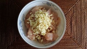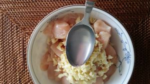鸡腿肉去皮后切块,加入盐、姜末、蒜末、生抽。