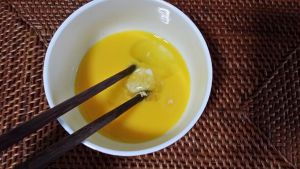 让腌制好的鸡块放入鸡蛋液里滚一下,粘满蛋液