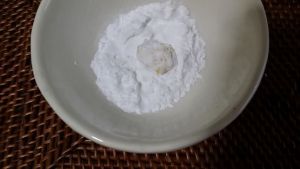 然后均匀的裹上干淀粉。裹完干淀粉再回到鸡蛋液里滚一圈,使鸡块上粘满蛋液。