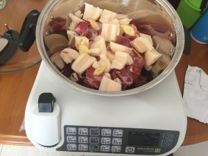 盖上锅盖,选择“靓汤—大骨汤”模式,开锅后撇去血沫,耐心等待~时间到后,将汤盛出,放入适量食盐,调味