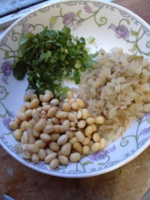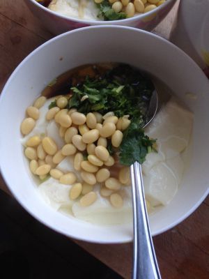 豆腐脑成型的过程可以准备辅料,榨菜和香菜都切碎,黄豆在锅里加水煮熟。