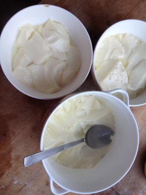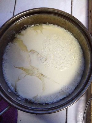 用10毫升温开水花开3克内脂,将烧开的豆浆再次过滤进化开的内脂里,搅拌均匀然后加盖静直20分钟。