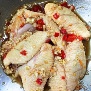 鸡中翅划三刀, 将所有材料倒入与鸡翅拌匀,盖上保鲜膜,入冰箱腌制2小时。