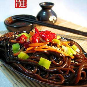 蕨根粉放水锅里煮熟,过凉水后沥去水;小红辣椒和葱切小段,胡萝卜切丝入水焯熟